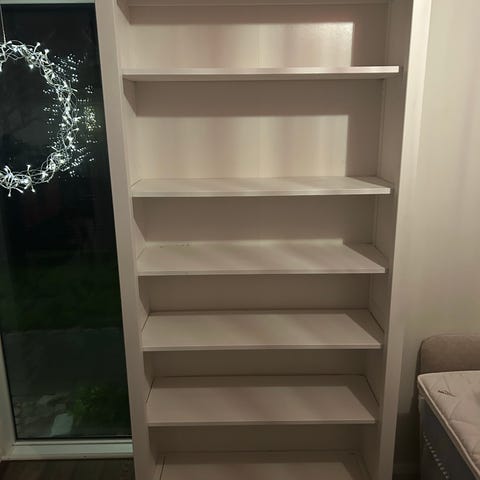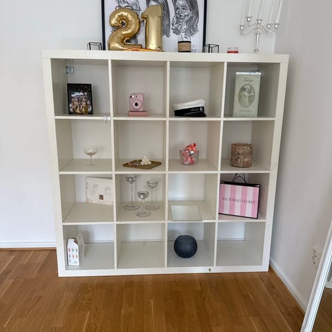 Notera att det finns små borrhåll på sidorna då hyllorna tidigare varit sammansatta. Innehållet i hyllorna ingår ej.