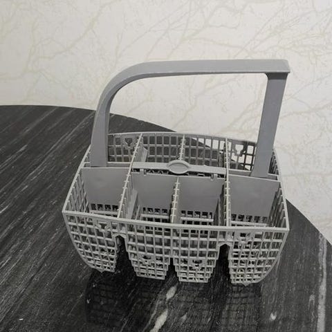 Bestickkorg i beige plast med sex fack. Utrustad med handtag för enkel förflyttning. Lämplig för förvaring av bestick eller andra köksredskap, exempelvis i diskmaskin eller på köksbänk.