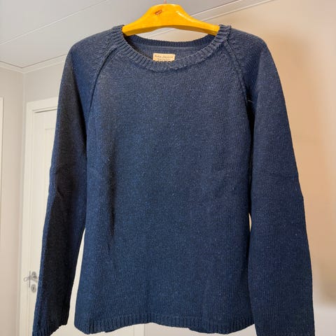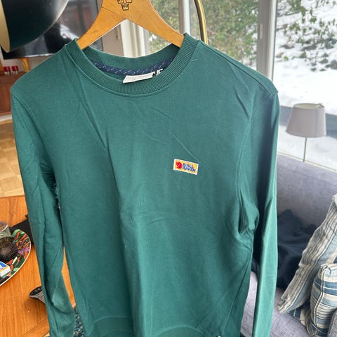 Fjällräven Övik Knit Sweater i storlek M. Klassisk ulltröja i grått, blått och olivgrönt. 100% ull med förstärkta armbågar. Nypris ca 1 600–2 000 kr.