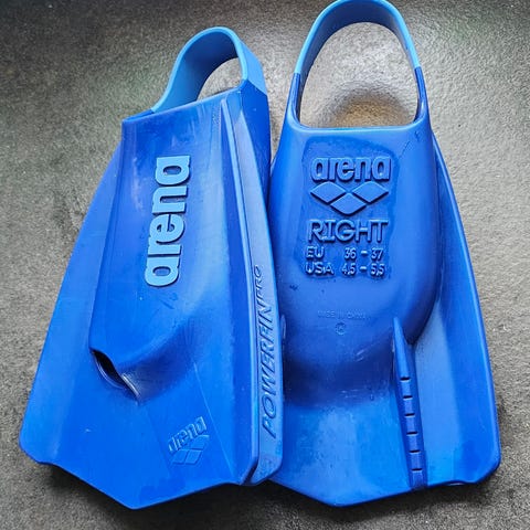 Arena simfenor med kort blad i blå färg. Storlek EU 38–39 (USA 6,5–7,5, UK 5–6, AUS 5–6) enligt märkning på fenorna. Modellen är avsedd för simträning och teknikövningar i bassäng. Öppen häl med fotficka i mjukt gummiliknande material för god passform runt foten. Passar för användning av både damer och herrar.