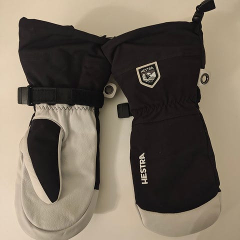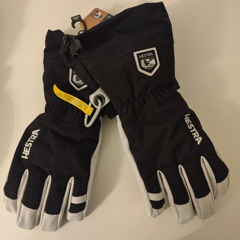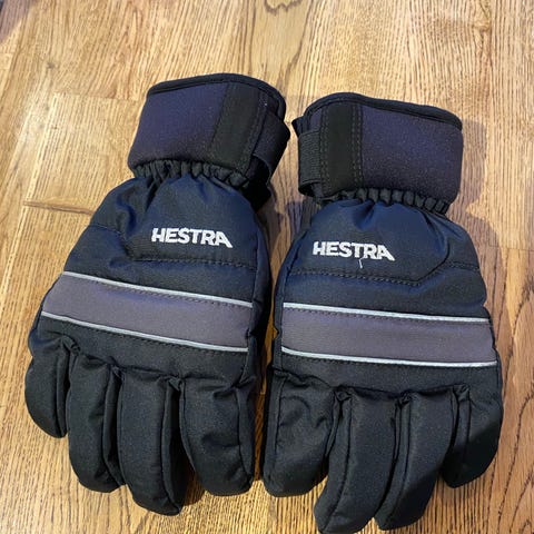 Hestra skidhandskar i storlek 6. Handskarna har ovandel i svart textil och innerhand i ljust läder. Utrustade med justerbar rem runt handleden, dragsko upptill samt handledsremmar med Hestra-tryck. Lämpliga för skidåkning och andra vinteraktiviteter där varma och tåliga handskar behövs. 500kr, finns i Åhus, skickas ej, prutat och klart