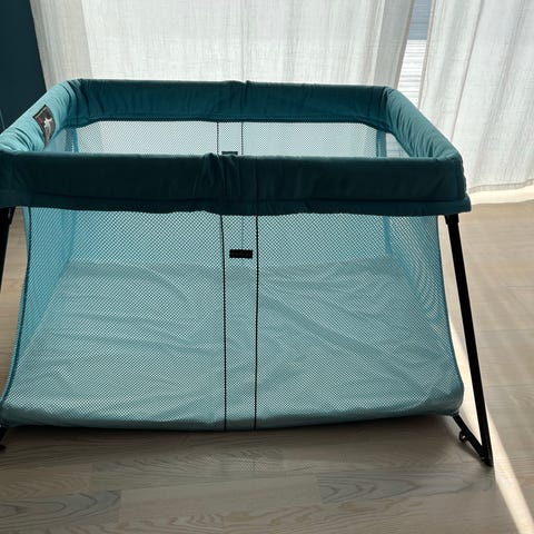 Babybjörn resesäng i blått tyg med nätpaneler på sidorna. Sängen är hopfällbar och levereras med tillhörande bärväska för enkel transport och förvaring. Passar som extrasäng eller sovplats för barn vid resor eller tillfälliga övernattningar.