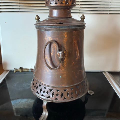 Beskrivning: En vacker, handdriven samovar/tekanna med dekorativa gravyrer. Den består av flera delar: en fot med lufthål för glöd/kol, en vattenbehållare med pip och ett lock. Perfekt som inredningsdetalj eller för samlaren.
