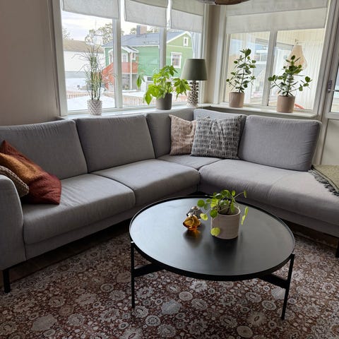 Grå soffa med schäslong, inköpt juni 2025, i mycket gott skick. Endast avhämtning