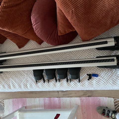 Takräcke med två svarta lasthållare i aluminium. Aerodynamisk profil med integrerade skenor för montering av tillbehör. Passar Skoda Enyaq. Låsbara ändfästen med nyckelhål för säker fastsättning på bilen. Lämpligt för transport av till exempel takbox, cykelhållare eller annan last som är avsedd för montering på takräcke.