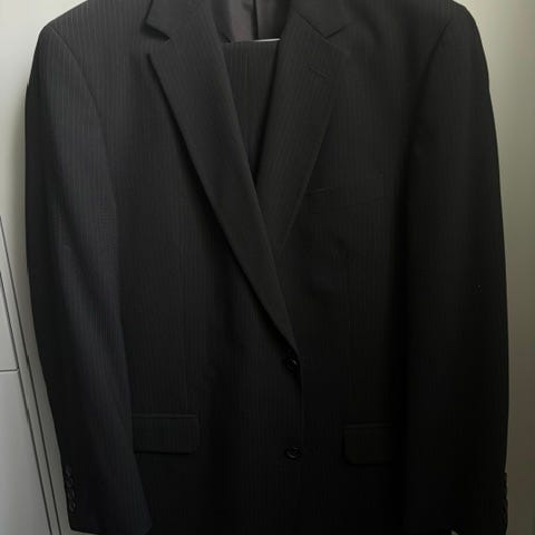 Oscar Jacobson kostym för herr i svart färg, storlek 46. Kostymen består av kavaj och byxa i linne. Kavajen har klassisk krage, fler inner- och ytterfickor samt knäppning fram. Byxan har pressveck, hällor för bälte och sidfickor. Liten slitning längs ner på byxan men inget stort. Passar som formellt plagg vid exempelvis arbete eller högtidliga tillfällen.