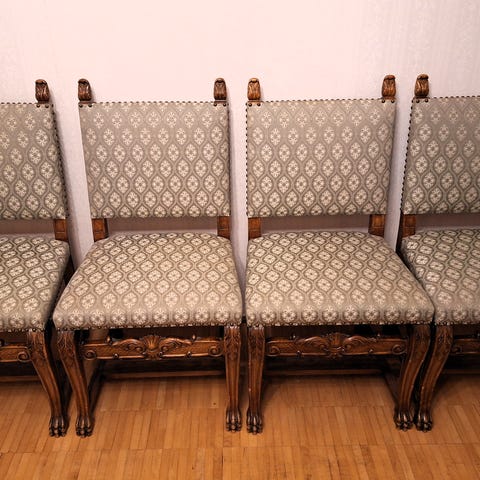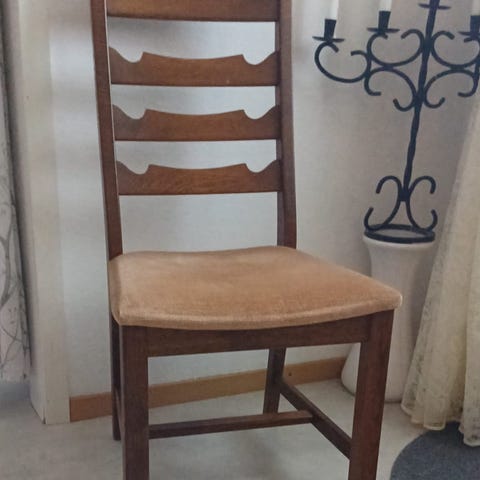 Vi säljer våra 4 fina ekstolar (blåaktig klädsel) och skänker de andra 4 som behöver lite omvårdnad.