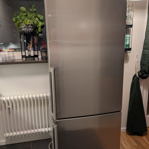 Kyl och frys med ytskikt av chrome/rostfritt utseende.