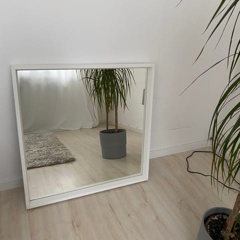 IKEA nissedal 65 x 65 cm Rektangulär spegel i vit ram tillsammans med två med IKEA Musik belysning separata ljusskenor med flera runda lampor. Spegeln kan användas som sminkspegel eller hall-/väggspegel och ljusskenorna ger jämn belysning runt spegeln. Passar för montering på vägg eller placering på plan yta beroende på behov och tillbehör som används.