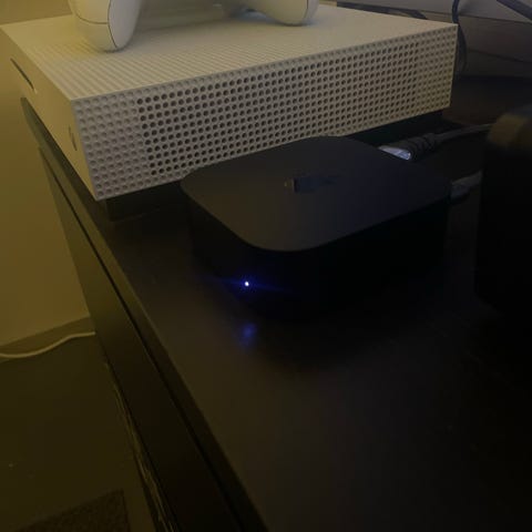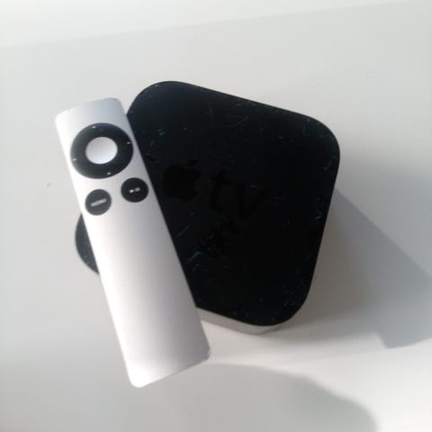 Apple TV mediaspelare med tillhörande fjärrkontroll. Enheten ansluts till TV via HDMI och har även nätverksport (Ethernet), optisk ljudutgång och USB-port för service. Fjärrkontrollen är i aluminium med styrknappar för navigering, meny och uppspelning/paus. Lämplig för uppspelning av digitalt innehåll på kompatibel TV eller skärm via Apple TV-plattformen.