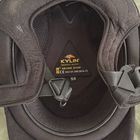 Kylin ridhjälm i svart färg, storlek 54. Hjälmen har dekorativ mittremsa och små detaljer längs ovansidan. Invändigt finns justerbart hakband och vadderad insida. Hjälmen är märkt med modellbeteckning och CE-information enligt bild.