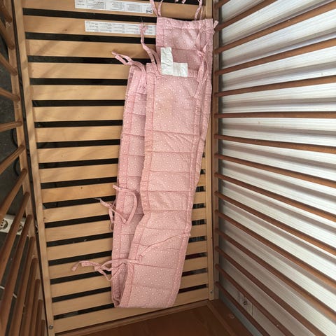 IKEA spjälsäng i vit färg. Klassisk modell med ribbor runtom och öppen kortsida för enkel åtkomst. Passar standardmadrass för spjälsäng. Sängen är avsedd för små barn och kan användas i sovrum eller barnrum. Textilier, spjälskydd och bäddning som syns på bilderna kan ingå eller tas bort enligt överenskommelse.