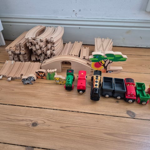BRIO trätåg och tågbana i blandad uppsättning. Innehåller olika raka och böjda träskenor, broar, ramper och tillbehör som station, fordon, gubbar. Delarna är kompatibla med BRIOs övriga tågsystem i trä och kan byggas ihop på flera olika sätt för varierande banor. Levereras samlat i plastlåda enligt bild.