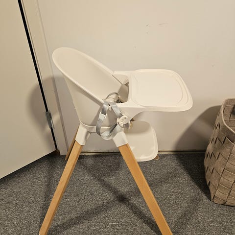 Stolen har fotstöd och öppning i ryggstödet. Passar vid matbord eller som sittplats för mindre barn i hemmet.