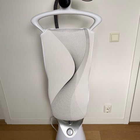 Philips EasyTouch Plus klädsteamer för vertikal ångstrykning av kläder och textilier. Enheten består av basenhet med vattenbehållare, ångslang och munstycke samt en integrerad upphängnings- och stödanordning för plagg. Avsedd för att fräscha upp och släta ut skrynklor på skjortor, klänningar, kavajer och andra plagg utan att använda traditionellt strykjärn. Passar för hemmabruk på olika typer av tyg enligt tillverkarens anvisningar.
