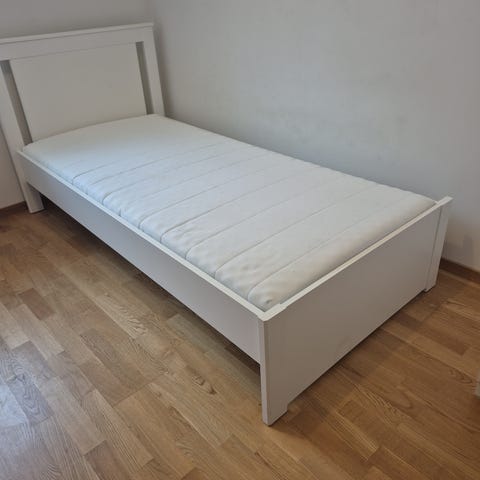 Babybay enkelsäng i vitmålat trä med ribbad sängbotten. Sängen har en husformad ram och låga sidor med spjälor längs långsidorna. Passar som barnsäng i barnrum. Madrass ingår inte om det inte anges separat i annonsen.