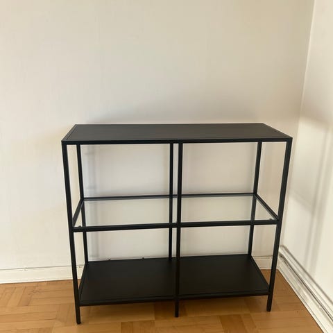 Hylla Vittsjö från IKEA, svart metall med glashylla i mitten.