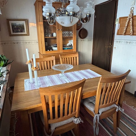 Säljer ett mycket fint och stabilt matbord i massiv ek tillsammans med 8 bekväma stolar i svart läder.