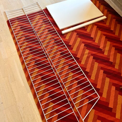 Helt oanvänd stringhylla med 2 svarta hyllplan i plåt. Hylldjup 18, gavelhöjd 77, 60 bred.