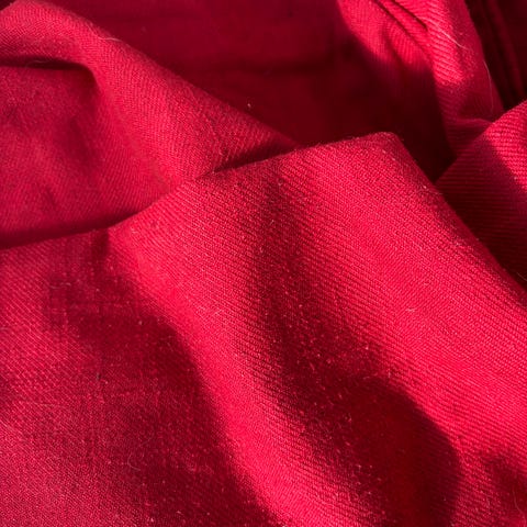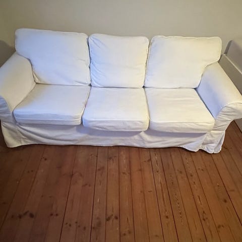 Hörnsoffa Ektorp med en röd och marinblå klädsel. Blå är tvättad men den röda kan behöva tvättas. Hund finns i hemmet.
