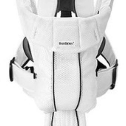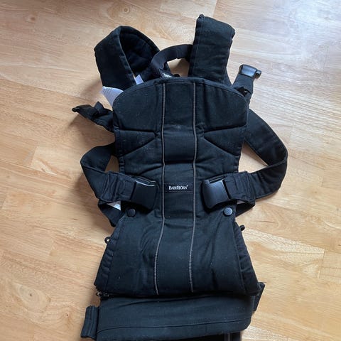 BabyBjörn bärsele i svart tyg med orange detaljer. Justerbara axelremmar och midjerem för att passa olika bärare. Selen har flera spännen och remmar för säker fastsättning och stöd för barnet. Instruktionsetikett med bildsteg finns kvar på insidan för vägledning vid användning. Både spädbarn och småbarn sitter tryggt nära kroppen vid vardagsaktiviteter och promenader.