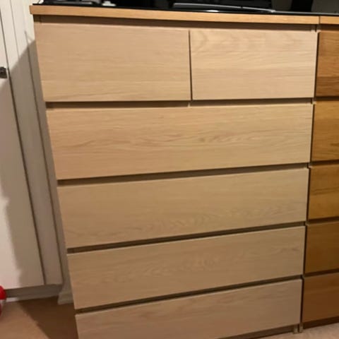 IKEA MALM byrå i ek. Praktisk hög, smal byrå med fyra stora lådor och två små. Toppen går att öppna och har en inbyggd spegel och lite förvaring. Modellen verkar ha utgått på IKEA.