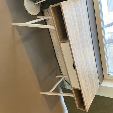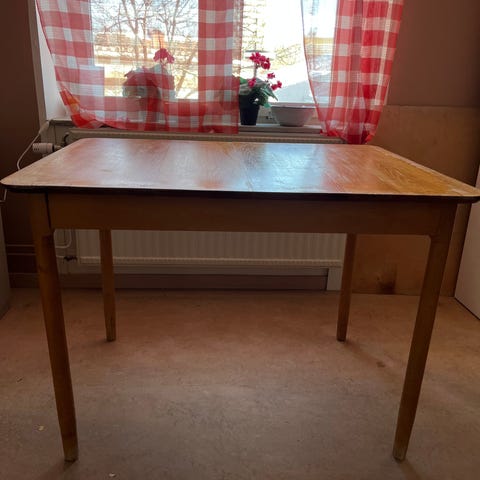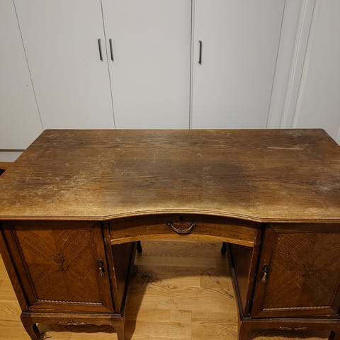 Ett fint gammalt skrivbord i trä, förmodligen från 40-talet. Förvaring både fram och bak. Skrivbordsytan är i behov av renovering, det finns synliga repor och fläckar, annars fullt fungerande. Hämtas i centrala Uppsala.