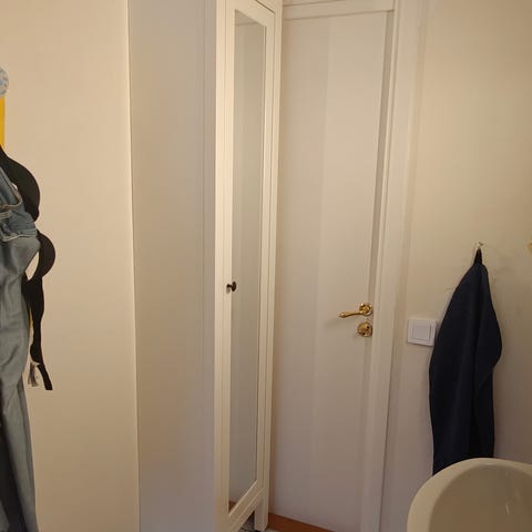 Ikea högskåp med spegeldörr i vit färg. Skåpet är högt och smalt med en spegel på utsidan av dörren och ett runt handtag. Invändigt finns hyllplan för förvaring av till exempel badrumsartiklar, textilier eller andra mindre saker. Passar bra i badrum eller andra utrymmen där man vill kombinera förvaring med spegel.