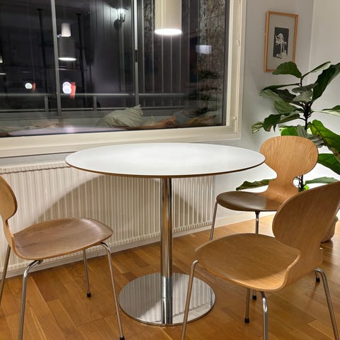 Mio Plaine vit matgrupp bestående av ett rektangulärt matbord, 140 cm långt och fyra stolar. Bordsskivan är vit med smala metallben. Stolarna är vita med formad sits och rygg samt kromfärgade ben. Som nya.