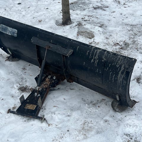 P. Olssons Eft. Kraftigt litet snöblad i röd metall. Utrustad med justerbar infästning med hålskiva och fästarm diameter 58mm. Skrapan har slitskena i metall längs nederkanten för arbete mot mark, samt justerbara släpskor. Färg: röd. Material: metall/stål.