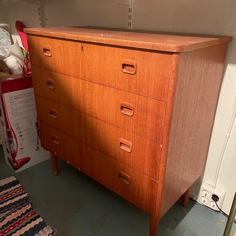 Mahogny (?) med snygga handtag i mässing. Fint hantverk, hög kvalitet. Från 1950-60 talet ca.