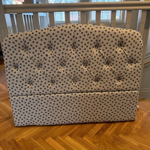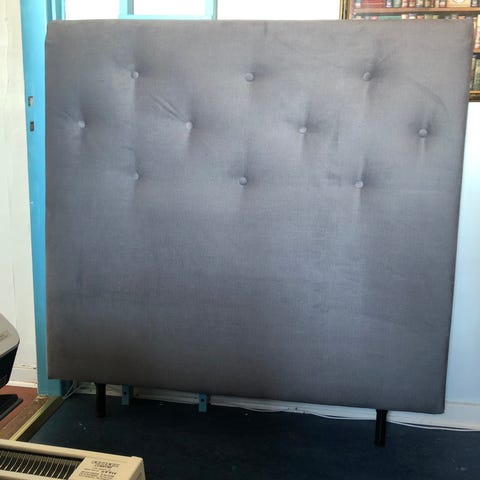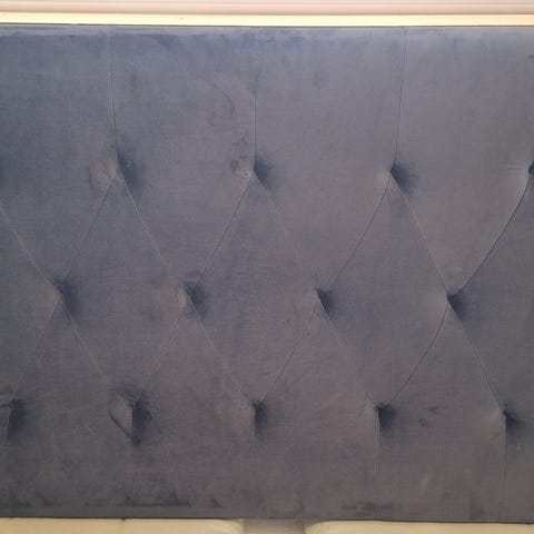 Mio sänggavel i blå sammet. Veckad textil på framsidan och slät baksida. Fästen för montering på säng. Man kan också ställa gaveln på golvet bakom sängen.