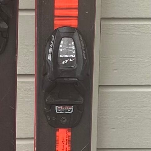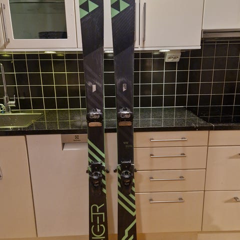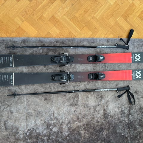 Ett par ungdomsskidor av kvalitetsmärket Völkl. 148 cm långa med Marker-bindning. Använda av två barn, repor finns men inget som påverkar funktionen.