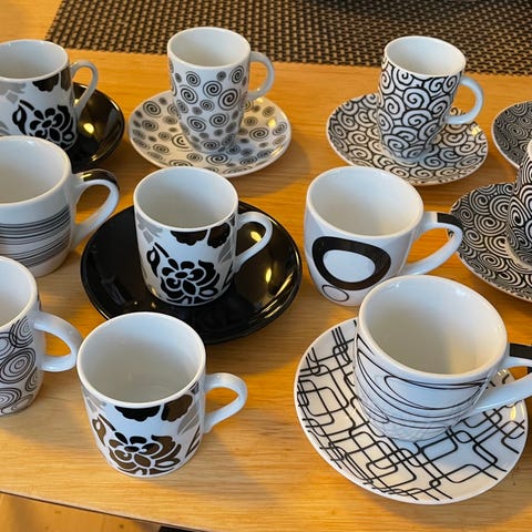 Kopparna rymmer ca 0,7 dl, h=5 cm, diameter = 6 cm. Fatens mått är 13 x 10 cm.