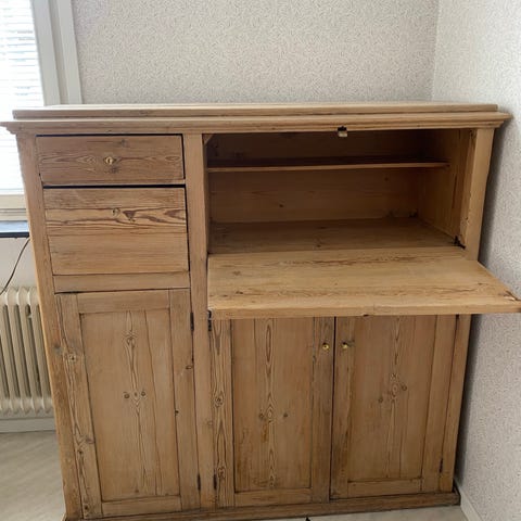 Skåp i trä med naturfärgad yta. Möbeln har två dörrar framtill samt två lådor upptill. Passar som förvaringsmöbel i exempelvis vardagsrum, hall eller kök. Står på golv och är anpassad för placering mot vägg.