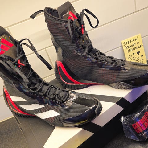 Jag säljer ett par Adidas Speedex 18 boxningsskor (svart/guld) - Storlek 44. Mycket gott skick, jag använde dem bara i 4 månader.
