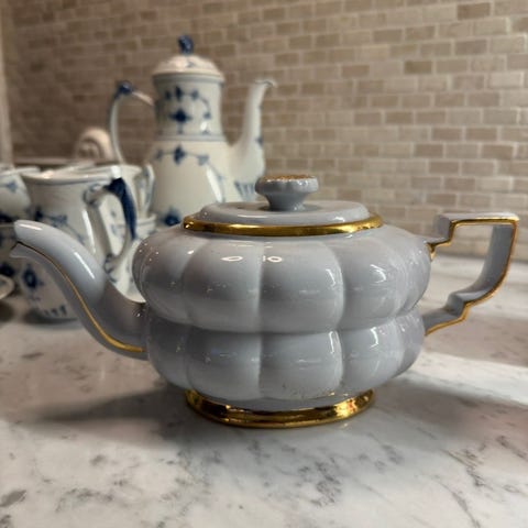Porslin tekanna med sockerskål, mjökkanna och kopp med fat.