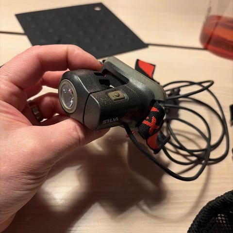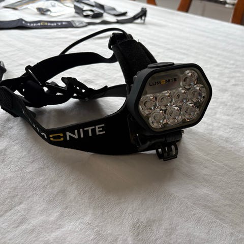 Kraftfull pannlampa med uppladdningsbart aggregat och stor ratt med olika ljusnivåer (bra med handskar på). Har använt en handfull gånger. Enda synliga slitage är från att ha legat i väska under turer.