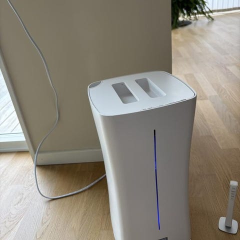 Luftfuktare med UV-ljus för att motverka att bakterier sprids. Möjlig att styra med medföljande fjärrkontroll men även med touchkontroll på luftfuktaren.