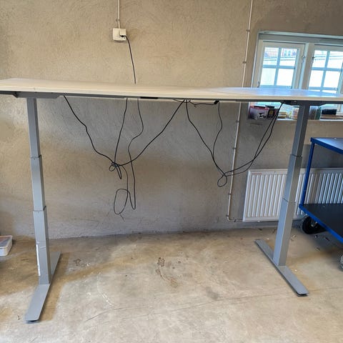 Skrivbord med vit bordsskiva och svart stativ, utrustat med kabelgenomföringar och svart skärmvägg baktill. Till skrivbordet hör en hög förvaringshurts i svart och vitt med låsbar dörr. Passar som arbetsplats i kontor eller hemmakontor med möjlighet till avskärmning och låsbar förvaring av dokument och utrustning. Elektriskt höj- och sänkbart. Eluttag, Kontorsstol svart ingår