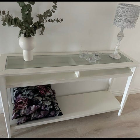 Mycket välvårdad snygg möbel med glashyllan i mitten och två lådor nertill.