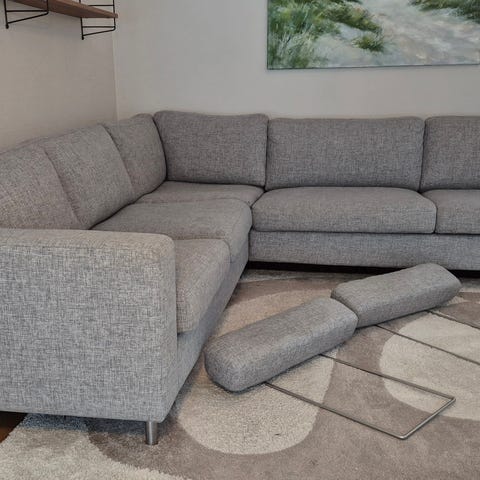 Brun hörnsoffa i ullmix och kromade ben. Den går att dela upp i två delar för transport. Hämtas 2026-02-26 till 2026-02-27.