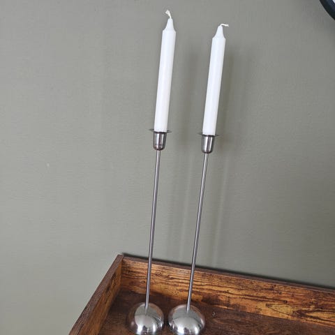 Hay ljusstake i metall. Ljusstaken har en minimalistisk, böjd stomme och är avsedd för kronljus eller liknande smala stearinljus. Passar som belysningsdetalj på bord, hylla eller fönsterbräda i hemmet.
