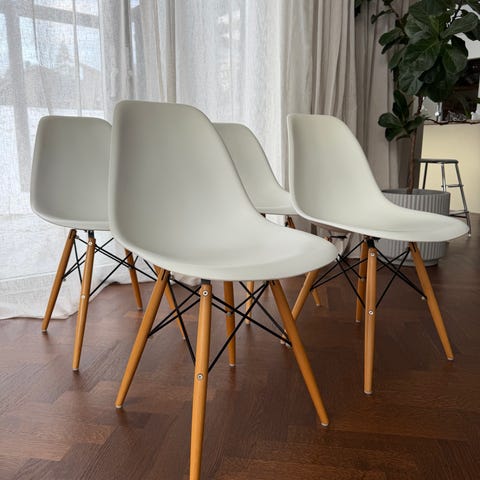 Säljer dessa fyra stolar. Plastsits och träben