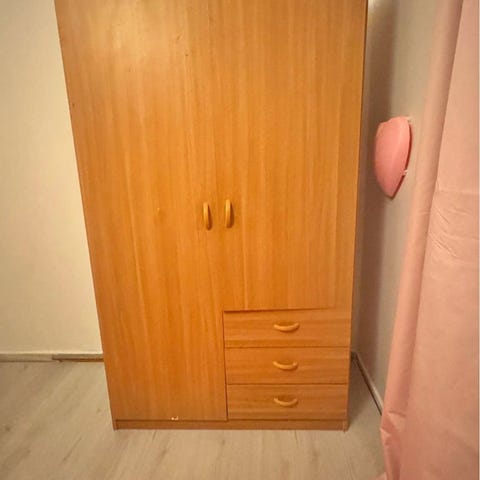 Garderob med 3 dörrar och 3 lådor med barnspärr på lådorna.