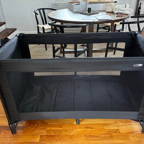 Carena resesäng i svart utförande. Sängen levereras i bärväska för enkel transport och förvaring. Passar som extra säng för barn vid resor eller övernattning. Materialet är en kombination av textil och metallram, med nätpaneler på sidorna för insyn och ventilation. Sängen fälls ihop kompakt när den inte används.