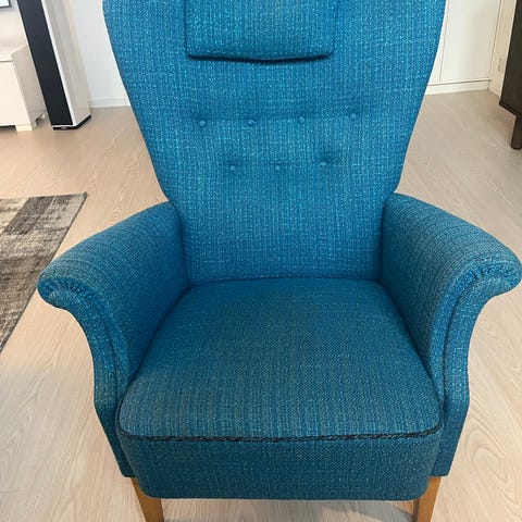 Det är en mycket fin och tidlös designklassiker med formpressad trästomme och vävd sits/rygg i ljus sadelgjord/textilband. Passar lika bra i hall, vardagsrum, sommarhus eller kontor.