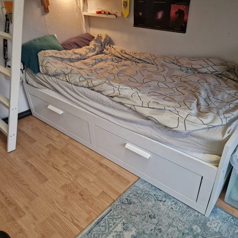 IKEA dagbädd med två utdragslådor i vit färg. Sängen fungerar både som soffa och säng.