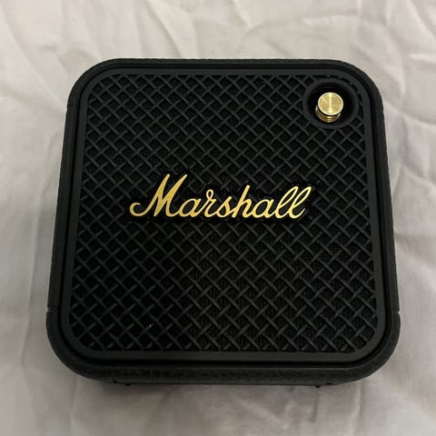 Marshall-högtalare i vitt. Kompakt modell med kontroller för volym, bas och diskant på ovansidan. Högtalaren har en bärrem på sidan och anslutning via kabel. Lämplig för användning hemma, för dator, mobil eller annan ljudkälla med kompatibel anslutning. Mycket bra batteritid och kan även anslutas och användas med ström.