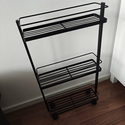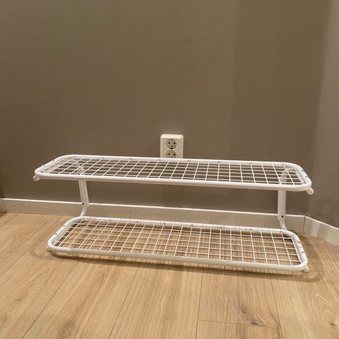 Praktiska skoställ. 3 styck. Går att fälla ihop när de inte används. Man kan stapla 3 på höjden. Mörkgrå lackad metall.